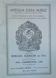 Francisco Nuñez Rodriguez (1841-1919) Guitarmaker & publisher who founded the business in Buenos Aires in 1870. He built guitars for Juan Alais & Julio Sagreras. Francisco learned lutherie from Salvador Ramirez, an Andalucian immigrant, who had been a disciple of Antonio Lorca of Malaga. |