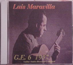 G.E. 6 Luis Maravilla 1957 Flamenco Guitar Solos Luis debuted as a guitarist in 1926 at the age of 12. In 1932 he travelled to South America with La Niña de Los Peines & Javier Molina. By the time this was recorded he had accompanied a long list of singers including Gracia de Triana. In 1952 he and his wife Pilar Calvo had appeared in the acclaimed film "Duende y Misterio". The guitar Luis used throughout his career and on this recording was made by Santos Hernandez of Madrid. CD $17.00