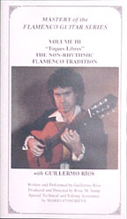 Guillermo Rios' "Mastery of Flamenco Guitar Series" DVDs $39.95 each o Vol. I- 16 sessions covering essential basic techniques as well as Alegrias,Tangos, Bulerias & Siguiriyas. 1 hour 40 minutes $39.95