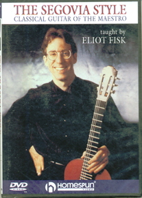75 min. w/ 23 page booklet $39.95 An incredible insight into the style of Segovia, with plenty of musicianship projects to attain. He also shows the "ironing" technique that Segovia used with vibrato. Eliot shows you the difference between the printed and recorded versions by Andres Segovia. I saw Eliot Fisk at Herbst theatre in San Francisco in '97. He played 20,000 1/32nd notes, and did 7 encores. Everyone got their money's worth, as well as Eliot was very gracious backstage to those that stopped by to say laudatory remarks. Don't wait for Eliot to come to town, bring him into your practice environment today. This just released DVD will help you improve your tone, technique and musicianship. The booklet contains the printed scores of every song dealt with in the video.